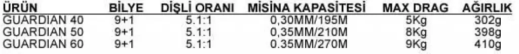 | Model | Devir Oranı | Bilye Sayısı | Ağırlık (g) | Drag Gücü (kg) | Misina Sarım Kapasitesi |