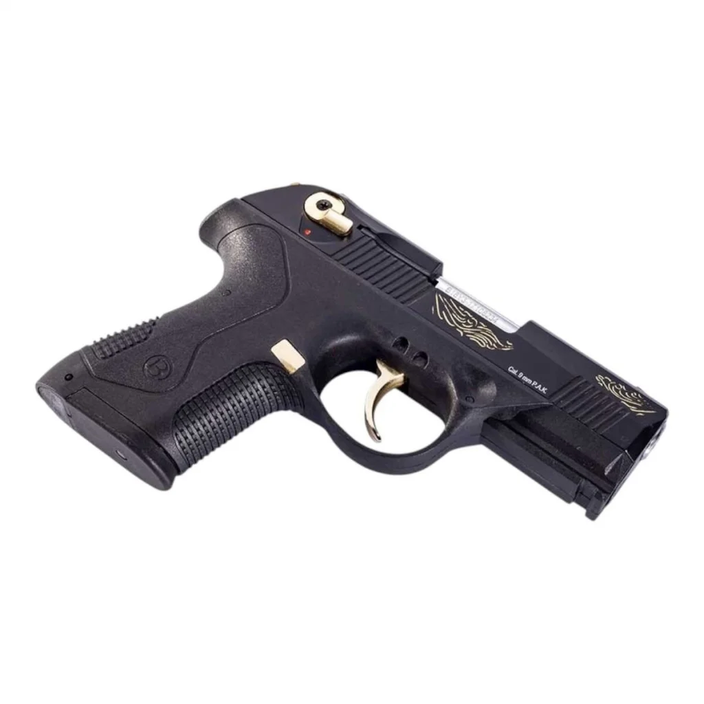 Blow TR 14 İşlemeli Altın Parçalı Kurusıkı Tabanca, hem yarı otomatik hem de tam otomatik atış imkanı sunan, polimer gövdesi ve altın işlemeli detaylarıyla dikkat çeken bir modeldir. 9 mm kalibreye sahip bu tabanca, 14+1 şarjör kapasitesi ile uzun süreli kullanım sağlar. 176,8 mm toplam uzunluğu, 34,3 mm genişliği ve 125 mm yüksekliği ile ergonomik bir tasarıma sahiptir. Çöl kumu, koyu toprak, turuncu, yeşil ve lacivert gibi farklı gövde rengi seçenekleri bulunmaktadır.