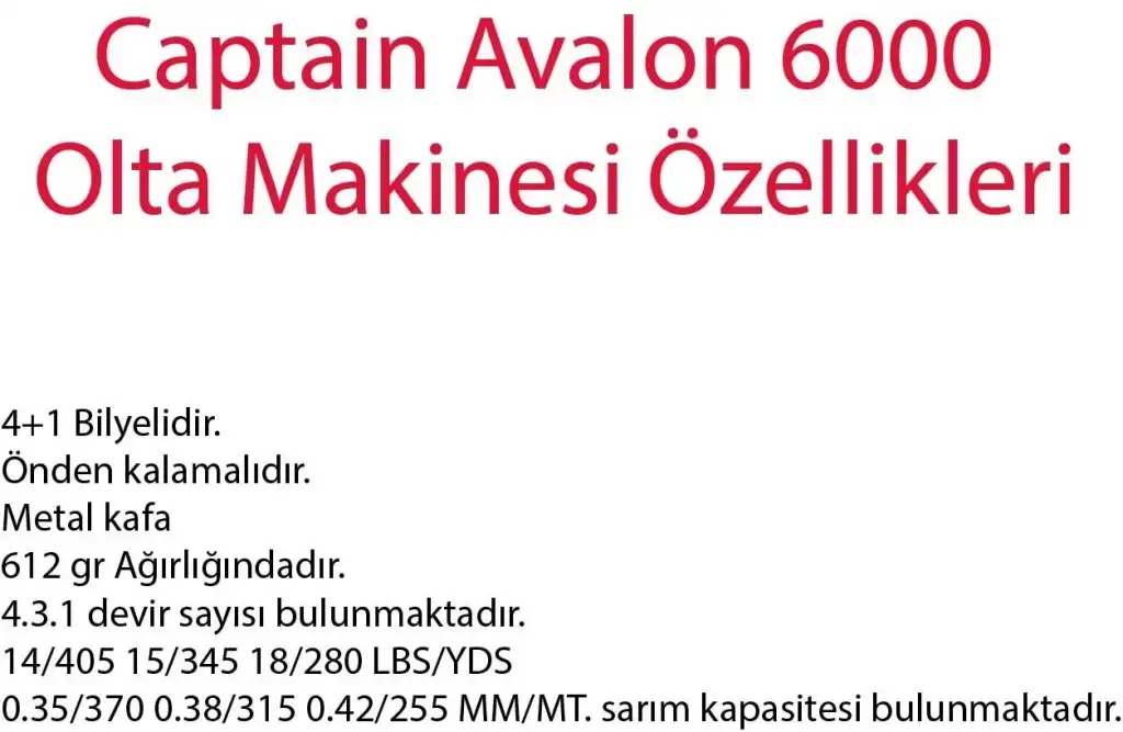 Captain Avalon Olta Makinesi, hem tatlı su hem de tuzlu su kullanımına uygun bir makinedir. Düzgün ve pürüssüz misina sarımı için bilgisayar destekli balans ayarı yapılmıştır. Olta kamışında geniş açılı ve sağlam atma teli mevcuttur.