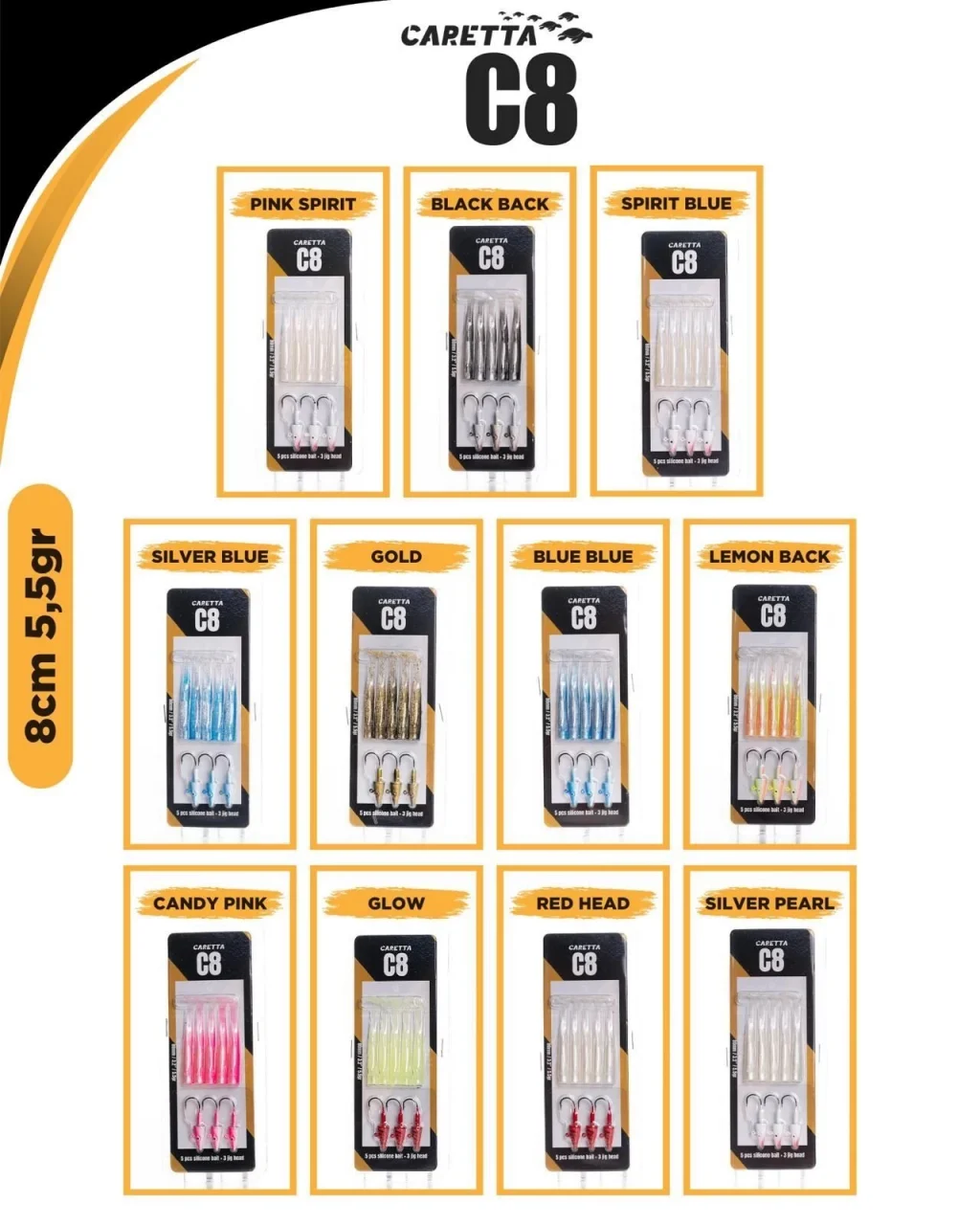 Caretta C8 Silikon Yem Seti, LRF avcılığında başarıyı hedefleyen tüm balıkçılar için vazgeçilmez bir üründür. Gerçekçi hareketleri, canlı renkleri ve güçlü jig head kombinasyonu sayesinde avcı balıkları cezbetmek artık çok daha kolay. Kaliteli malzemeleri sayesinde uzun ömürlü bir kullanım sunar.