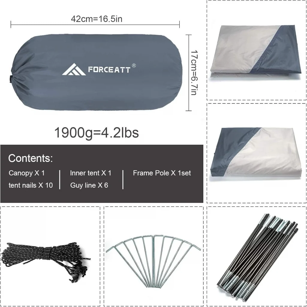 Forceatt Çift Kapılı 2 Kişilik Kamp Çadırı, doğa maceralarınızda size eşlik edecek dayanıklı, su geçirmez ve rüzgar geçirmez bir çadır modelidir. Sırt çantasıyla seyahat edenler, kampçılar ve yürüyüşçüler için ideal olan bu çadır, çift kapılı tasarımı ve havalandırma özellikleri ile konforlu bir deneyim sunar. Kolay kurulumu ve hafif yapısı ile öne çıkar.