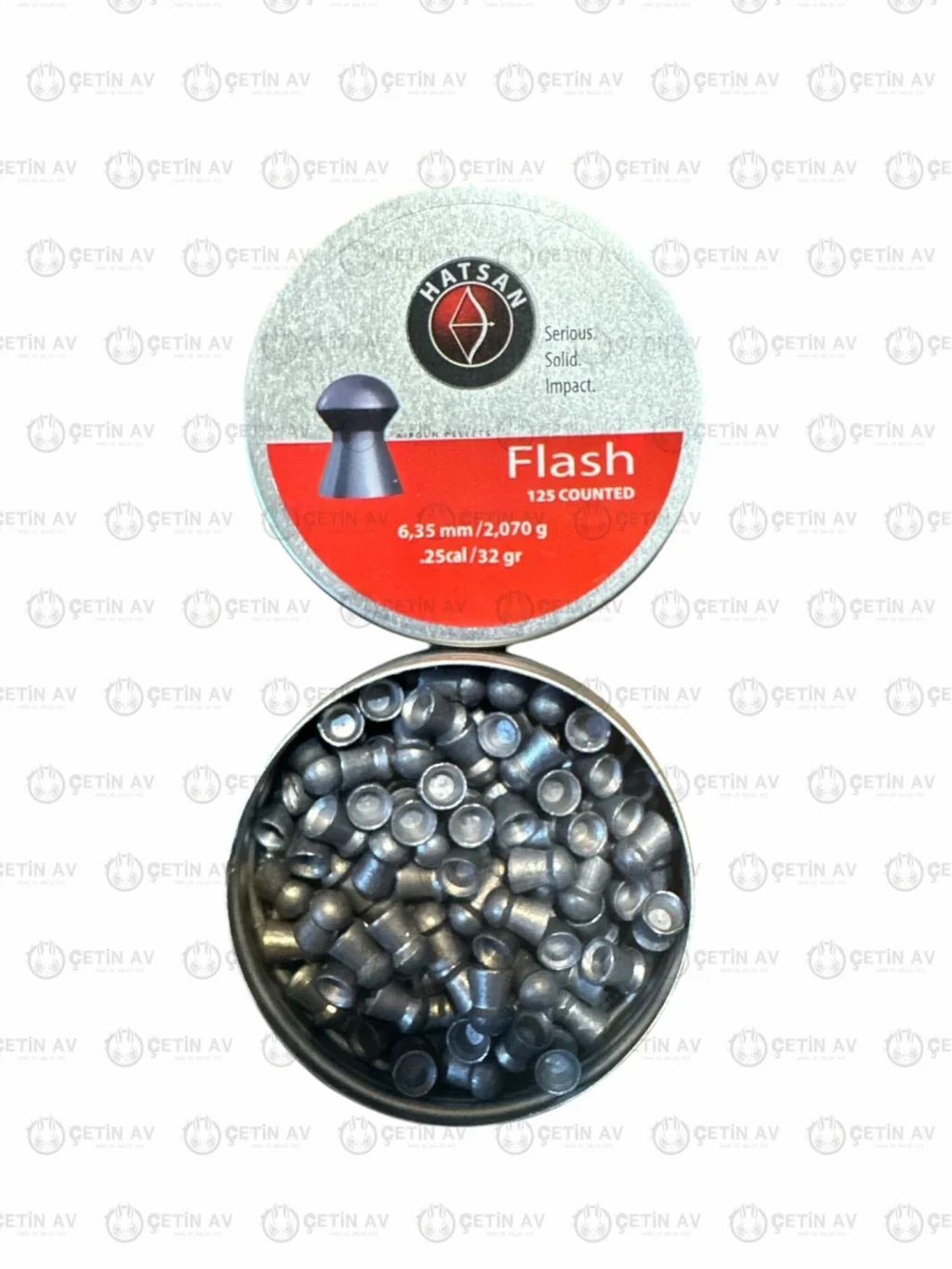 Hatsan Flash Havalı Tüfek Saçması 6.35mm / 32 Grain, Hatsan kalitesiyle üretilmiş, yüksek performanslı bir havalı tüfek saçmasıdır. .25 kalibre havalı tüfekleriniz için ideal olan bu saçma, hassas atışlar ve yüksek isabet oranı için tasarlanmıştır. 125 adetlik metal kutusu ile güvenli ve kolay saklama imkanı sunar.
