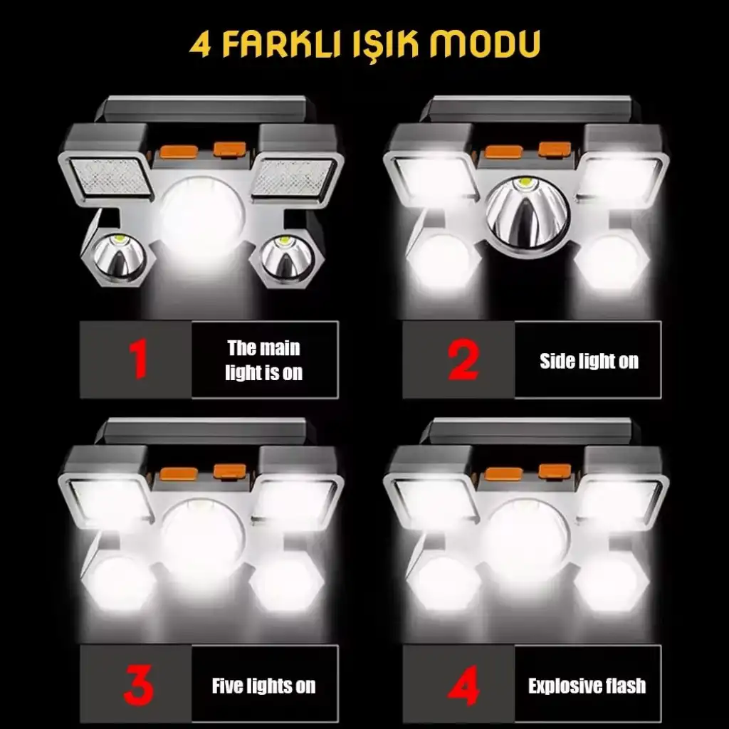 Kullanım: Düğmeye basıldığında, ortadaki COB LED tek başına yanar, sonra sol ve sağ alt-üst COB LED’ler ile birlikte 4’ü yanar. Tekrar basıldığında, köşe LED’ler ile birlikte ortadaki COB LED de yanar. Son olarak, 5 LED aynı anda flaşör modunda çalışır.