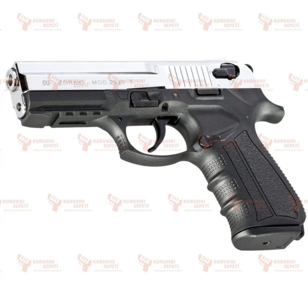 Zoraki Mod 2918 T Parlak Krom kurusıkı tabanca, yarı otomatik ve çift hareketli (double action) mekanizmasıyla öne çıkar. Tetik horoz düşürme özelliği sayesinde güvenli kullanım sunar. Fişek bitiminde yan buton aracılığıyla mekanizma kilidi devreye girer ve mekanizma kolayca düşürülebilir. Yine yan butonla pratik bir şarjör çıkarma imkanı sunar. Polimer gövdesi, tabancanın hem hafif hem de dayanıklı olmasını sağlar.