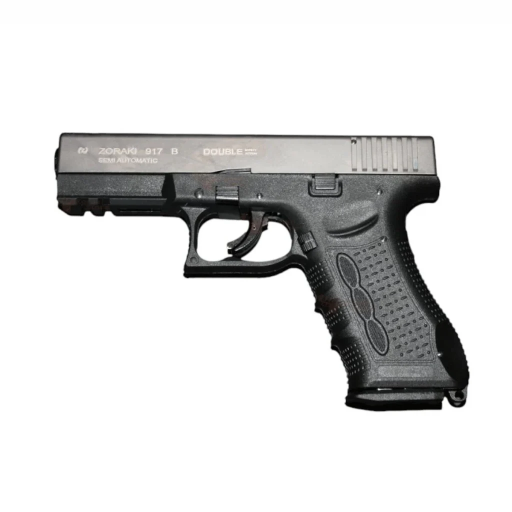 Zoraki Mod 917 T Füme kurusıkı tabanca, modern tasarımı ve gizli horoz mekanizması ile dikkat çeker. Yarı otomatik çalışma sistemi ve çift hareketli (double action) tetik yapısı, kullanıcıya güvenli ve pratik bir kullanım sunar. Yüksek şarjör kapasitesi ve polimer gövdesi ile hem konforlu taşımaya hem de uzun süreli kullanıma uygundur.